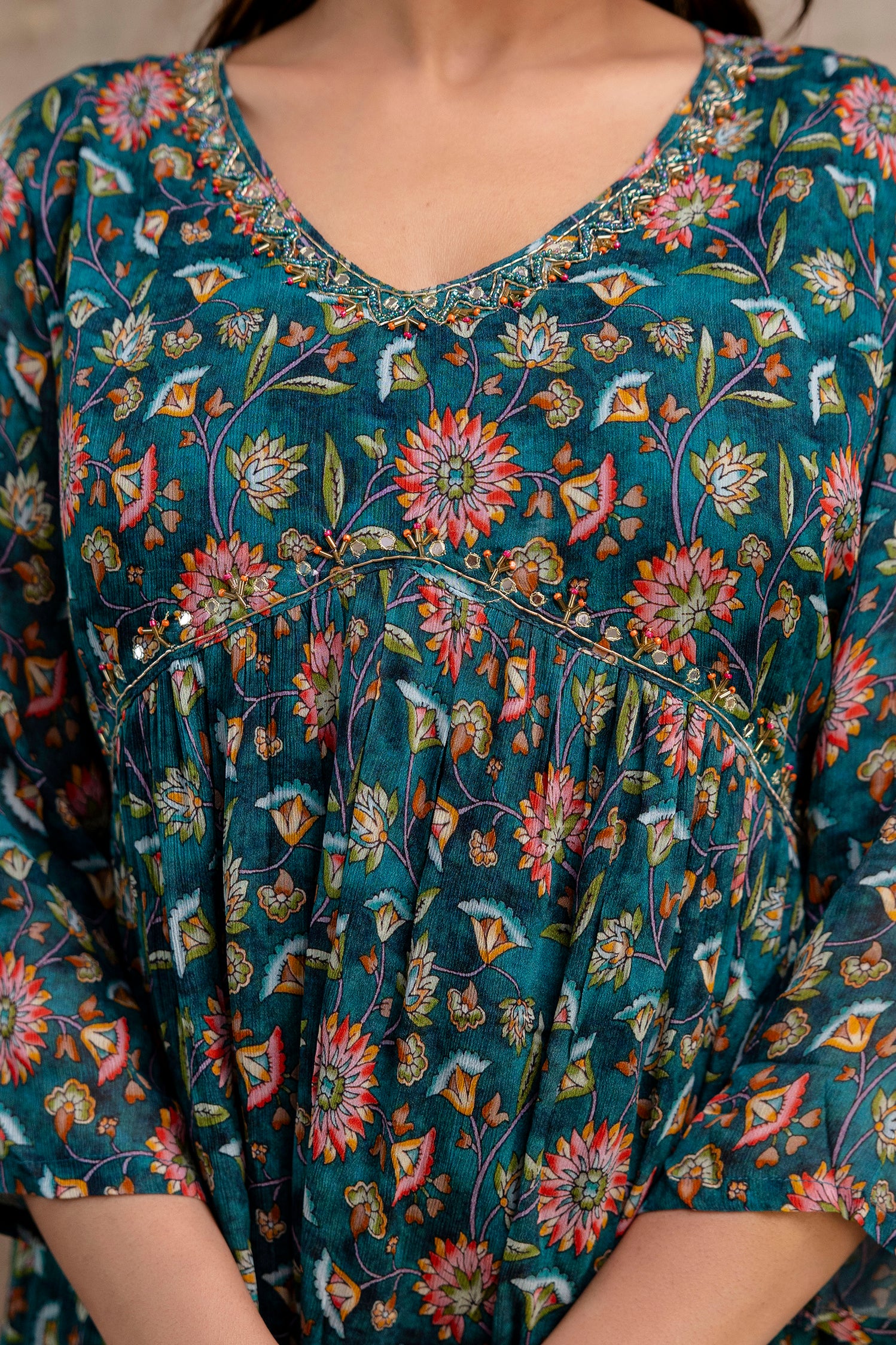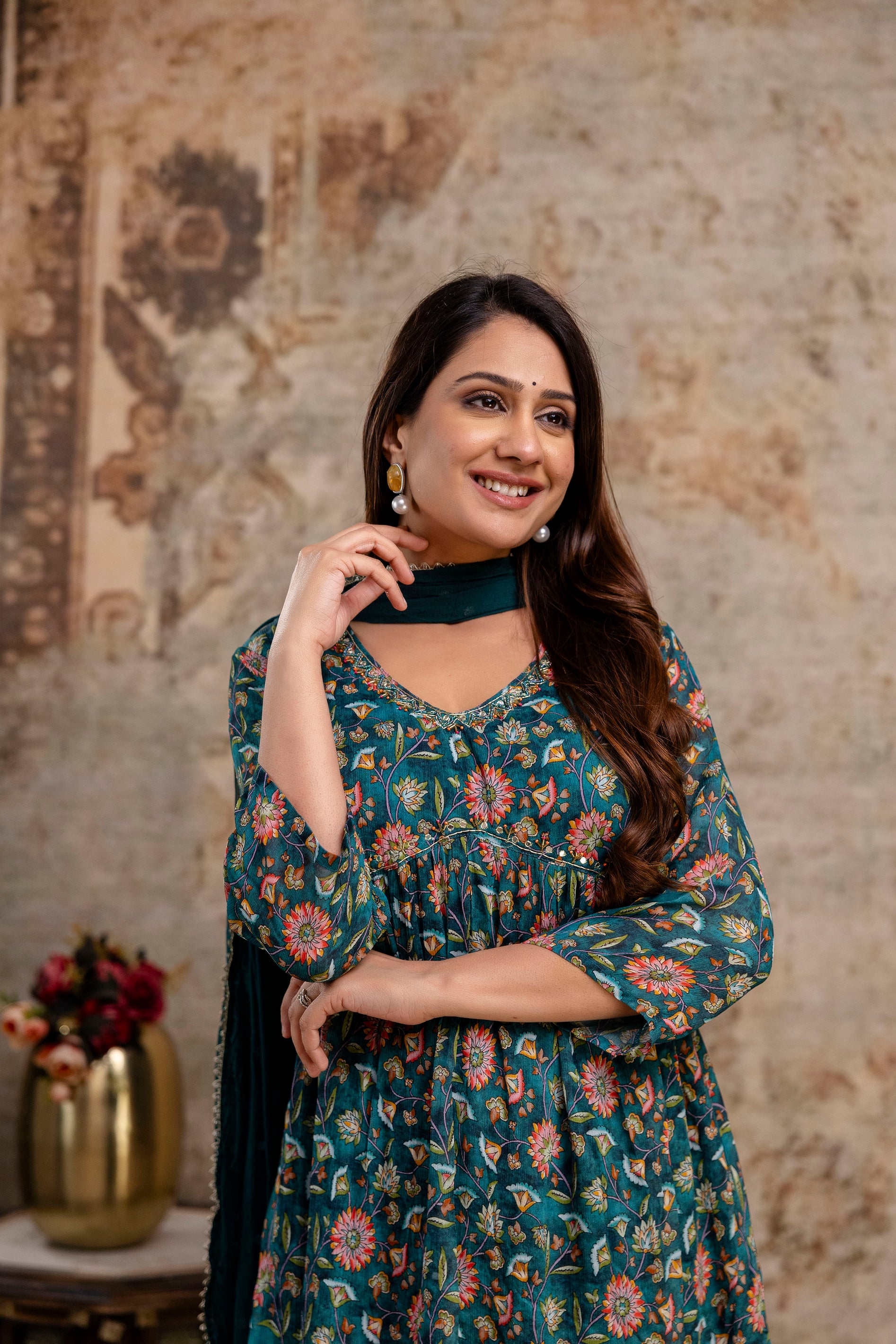 Chiffon Printed Aalia Cut Frock with V-Neck, Sequence Worked Dupatta & Plain Trouser
