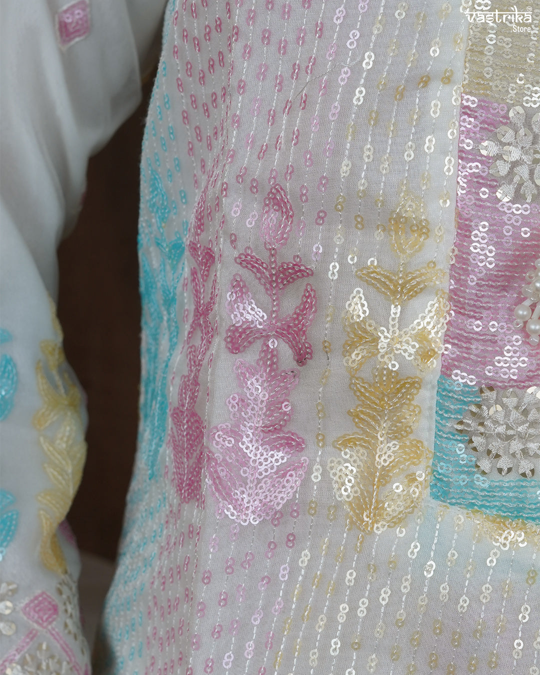 Kurti: Styled with a flattering V-neckline (gala) and collar, adorned with ✨ intricate sequin jaal work that adds a graceful shimmer.