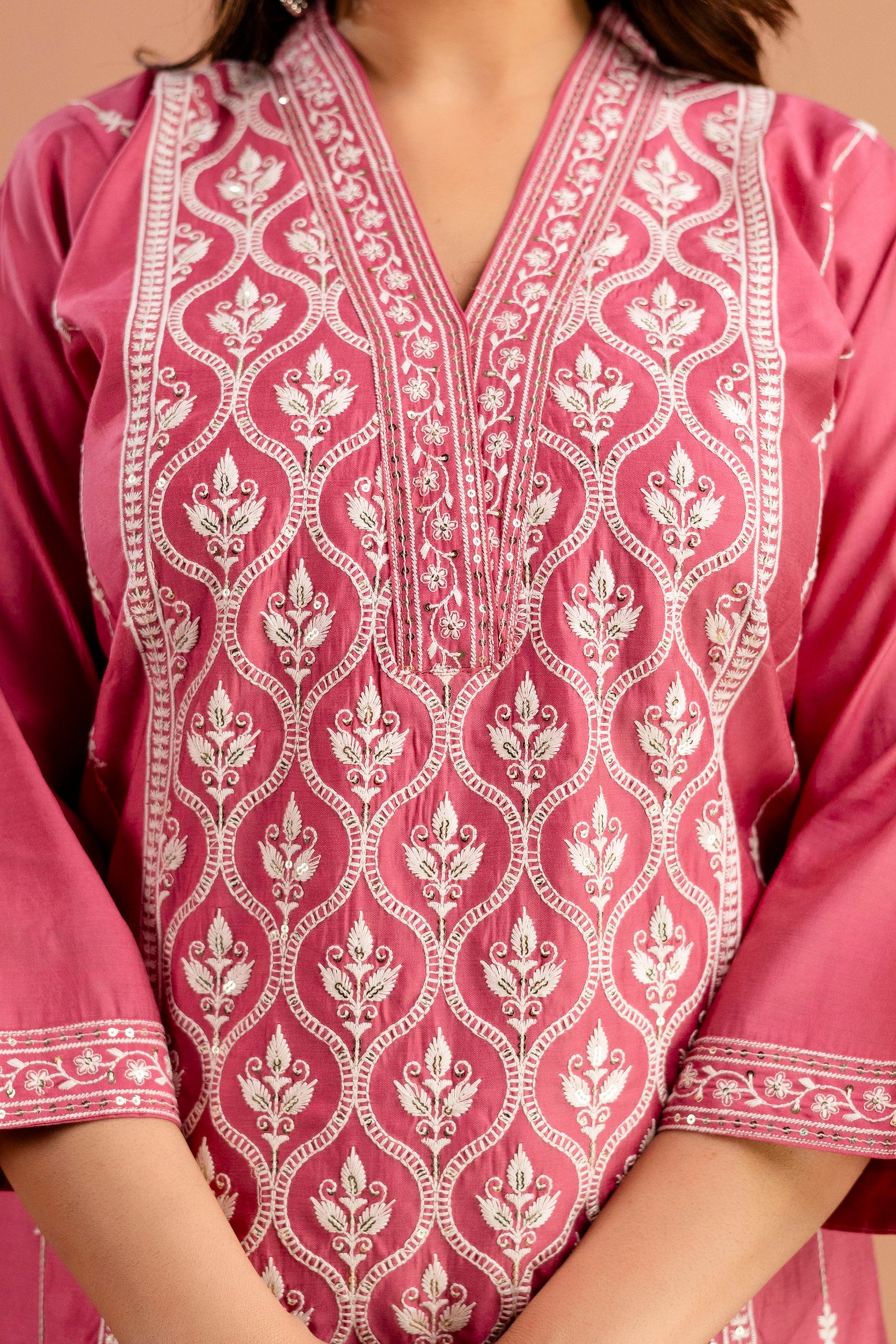 Full Embroidered Lucknavi Kurti with V-Neck, Organza Lucknavi Dupatta & Plain Trouser