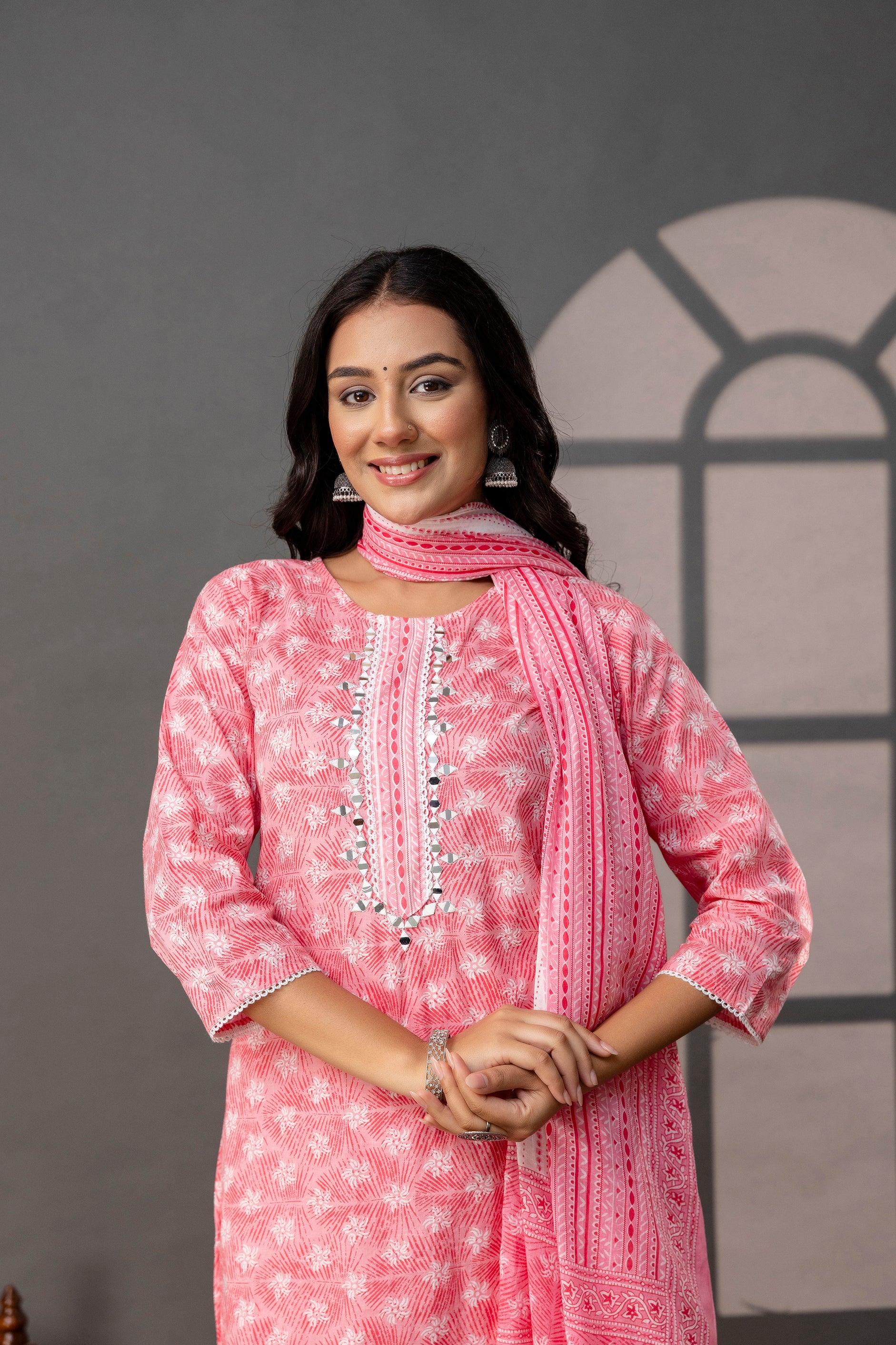 This vibrant printed kurti features intricate thread work and a flattering round neck, paired with coordinating printed pants and a matching dupatta. A chic, stylish set that effortlessly blends comfort with contemporary design.