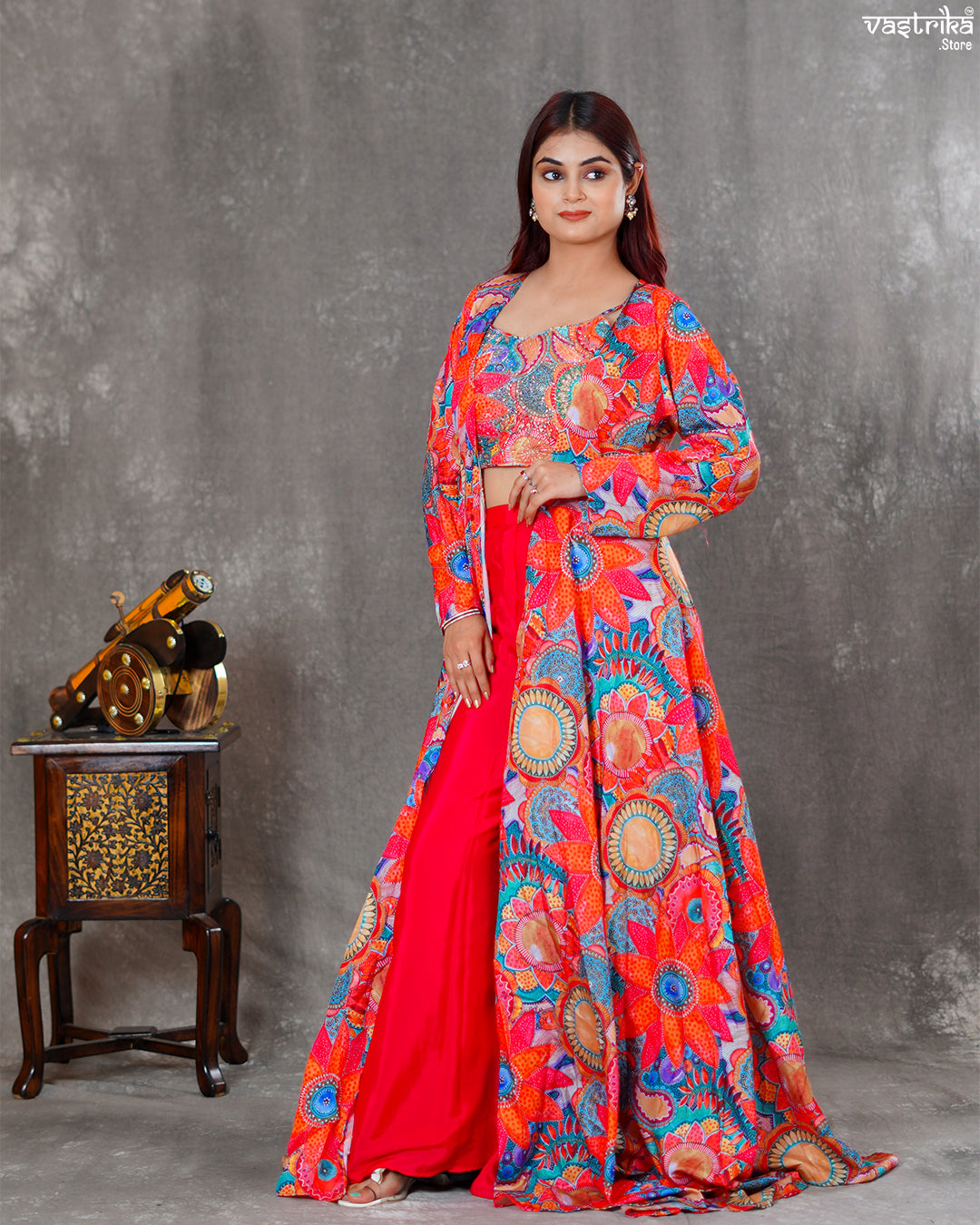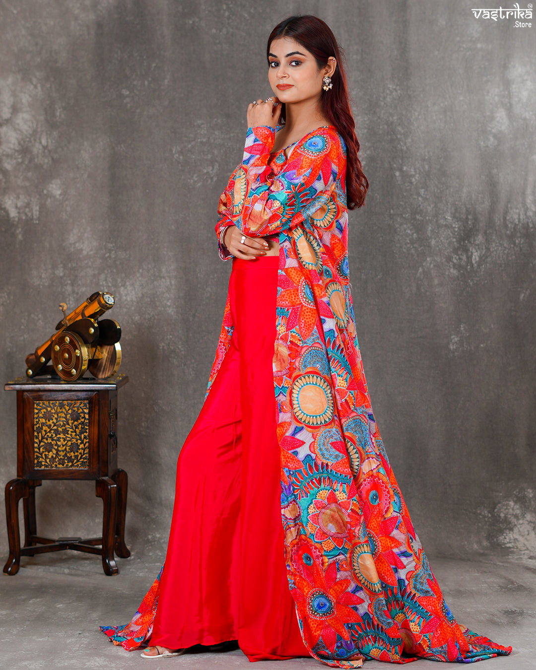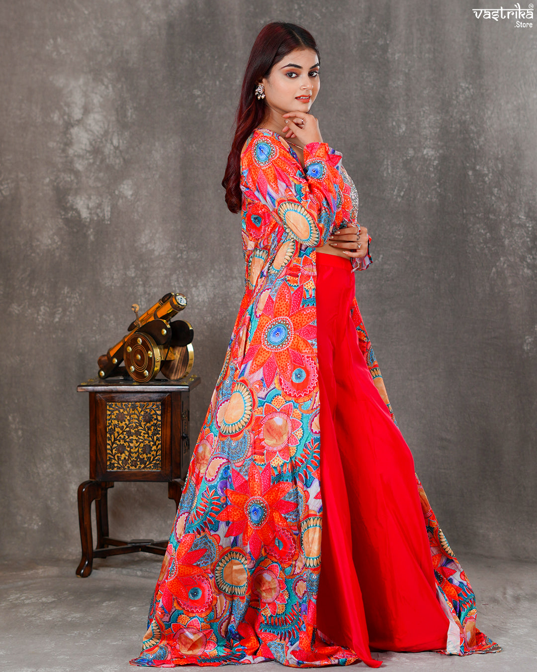 Redefine elegance with this trendy crop top set, featuring a Maslin crop top with a stylish flapper design and full-length shrug. The crape palazzos with printed detailing add a modern touch, while the handworked gala and step-style top with full sleeves enhance the sophisticated look. The plain flapper finish gives a graceful flow, making it ideal for both festive and party wear.