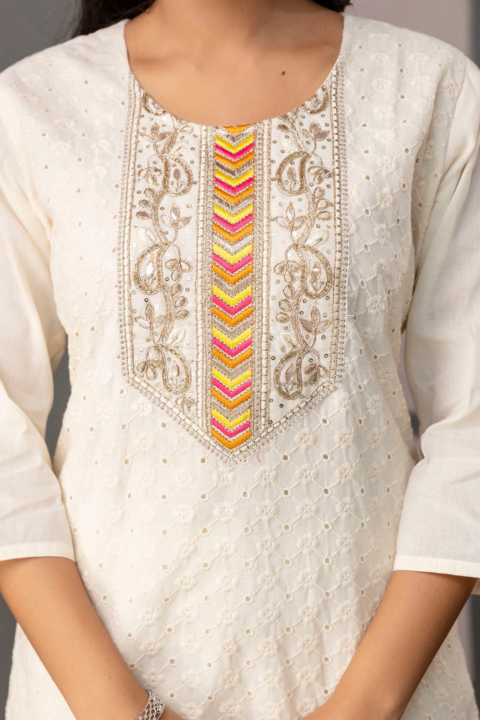 This stylish set features a printed kurti with delicate gala chicken work, showcasing intricate handcrafting at its best. Paired with comfortable cotton plain pants, it offers a perfect blend of elegance and ease. The multi-color tie-dye dupatta adds a pop of vibrant color, making it a unique and trendy choice for both casual and festive occasions.