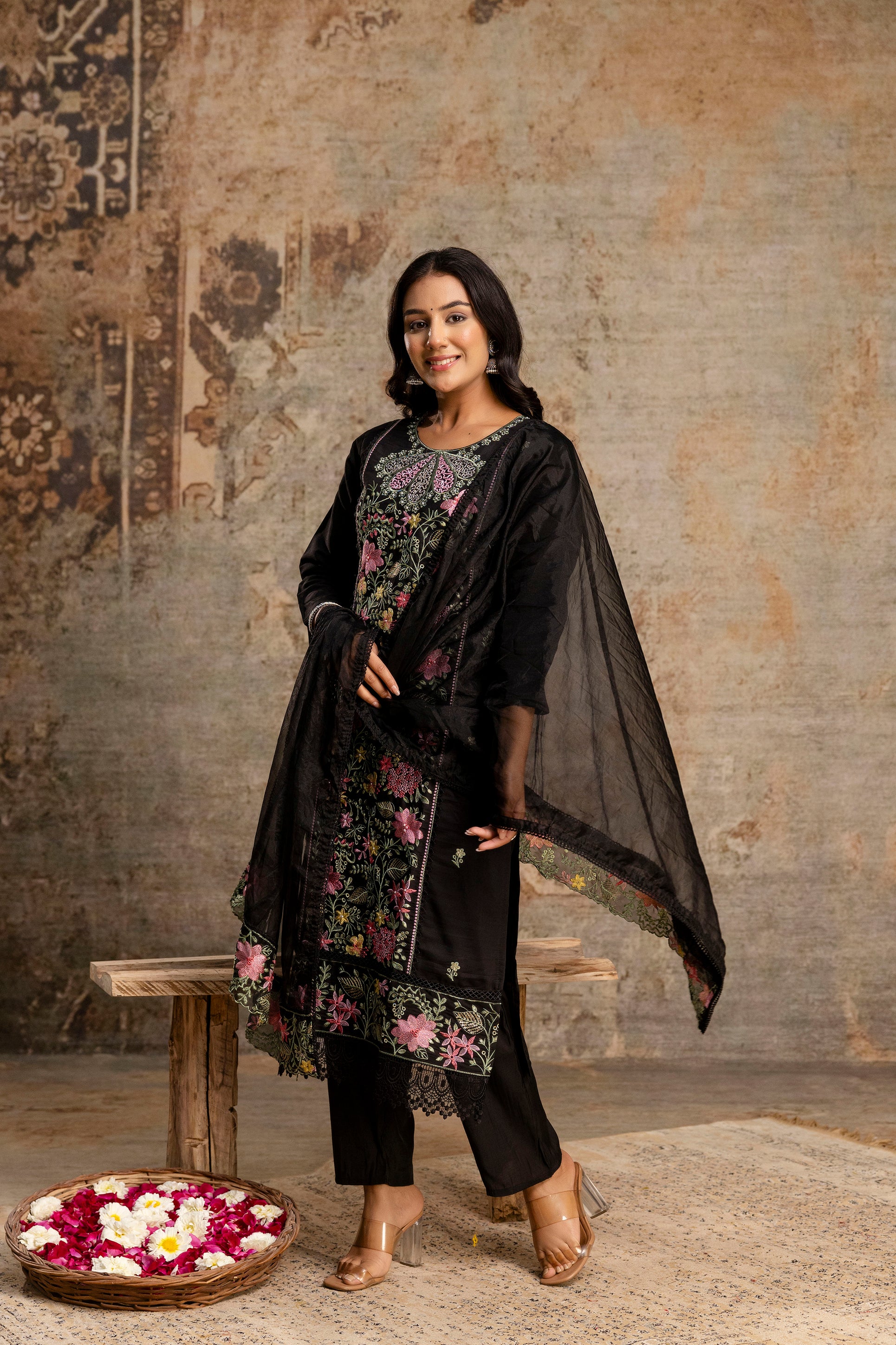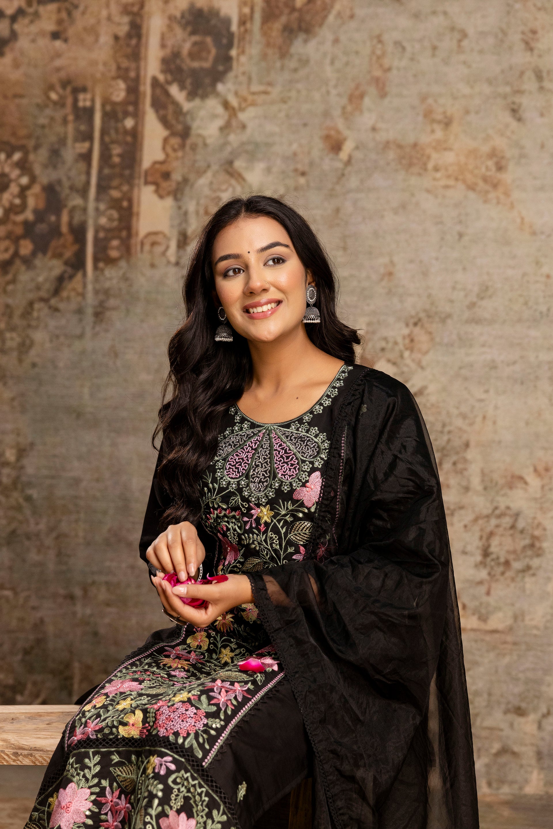 This stunning kurti features intricate Pakistani embroidery, paired with plain pants for a sleek look. The side-embroidered black dupatta adds a touch of sophistication, perfect for both formal and casual settings.