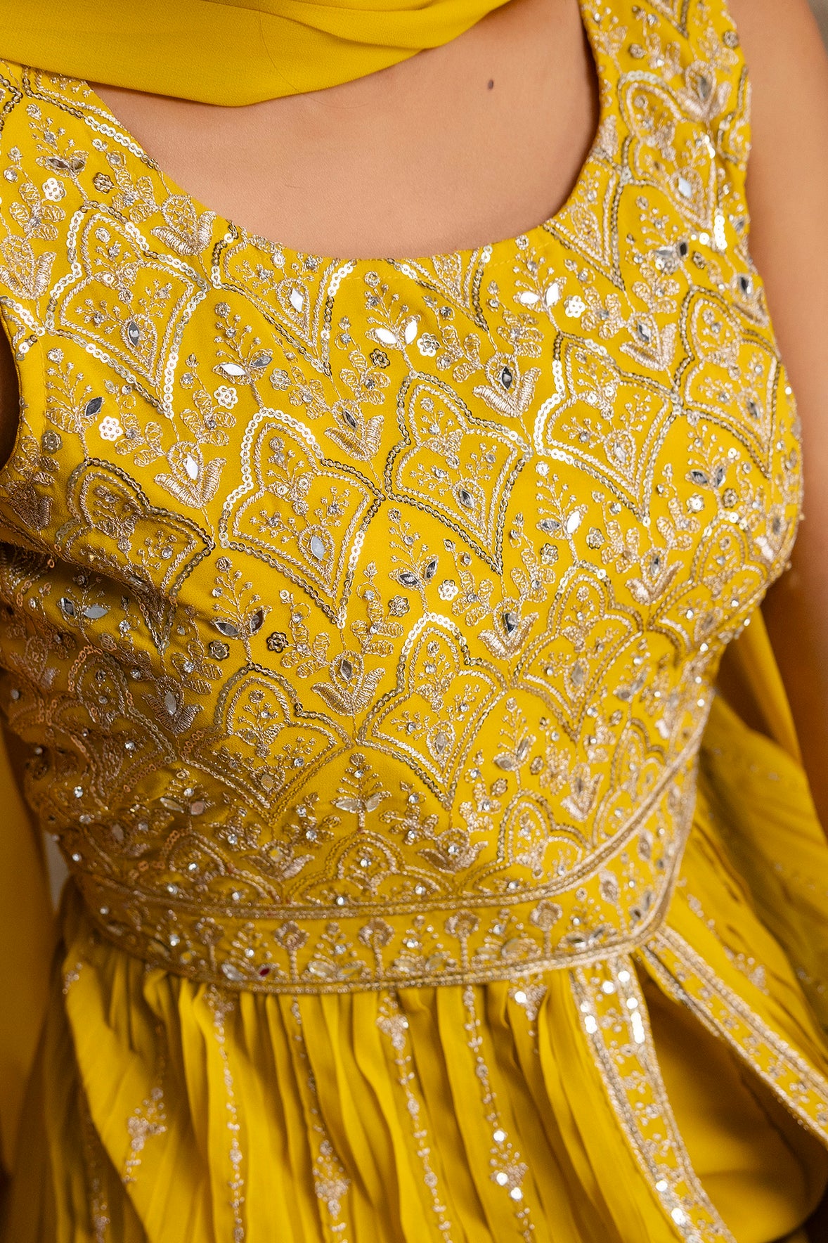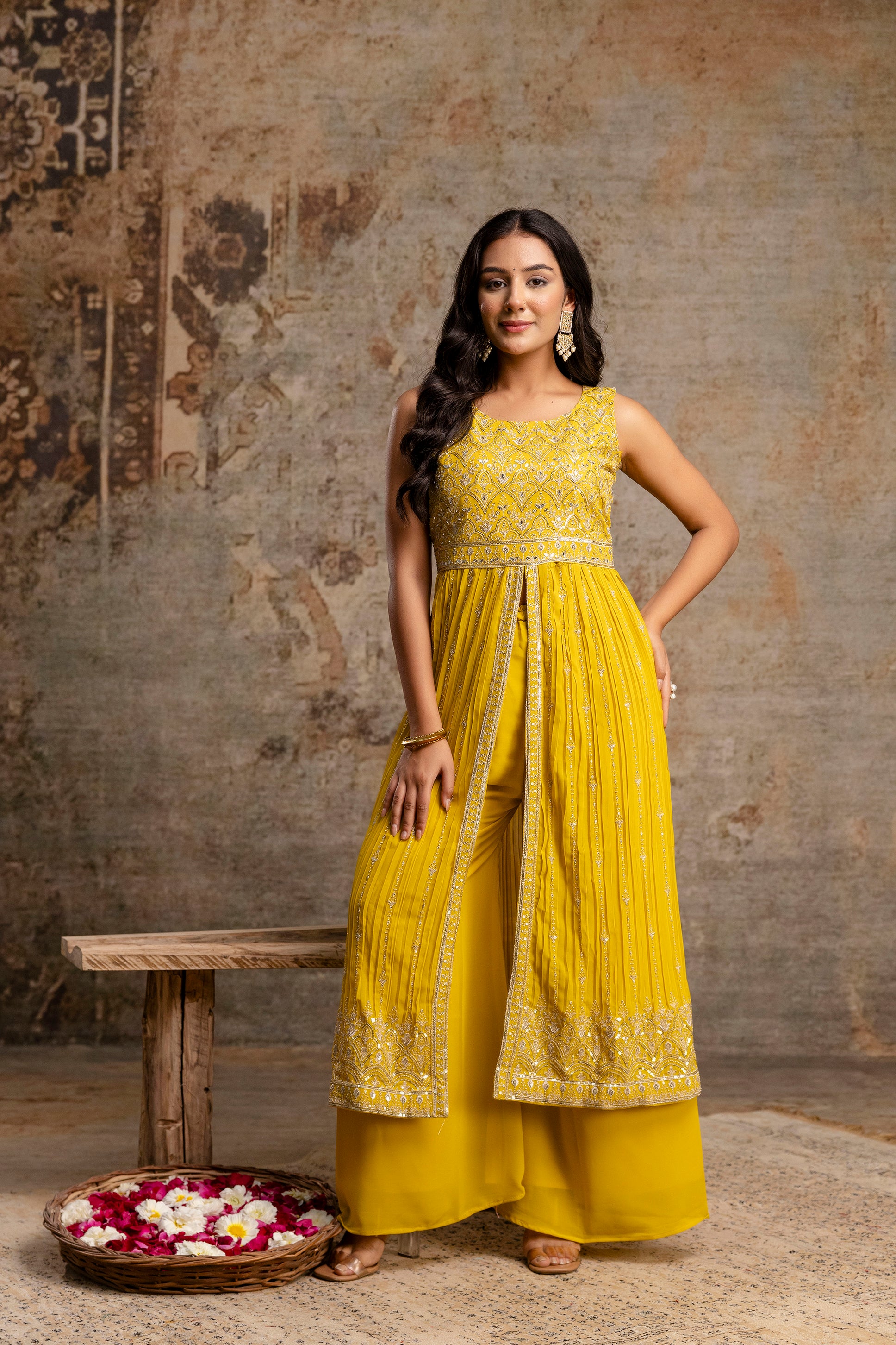 Step into chic elegance with this georgette front-cut long top set, featuring a round-neck top fully adorned with intricate jari work. The plain palazzos provide a comfortable and stylish base, complemented by a simple plain dupatta for a balanced and sophisticated look. Perfect for festive gatherings, casual parties, and special occasions.