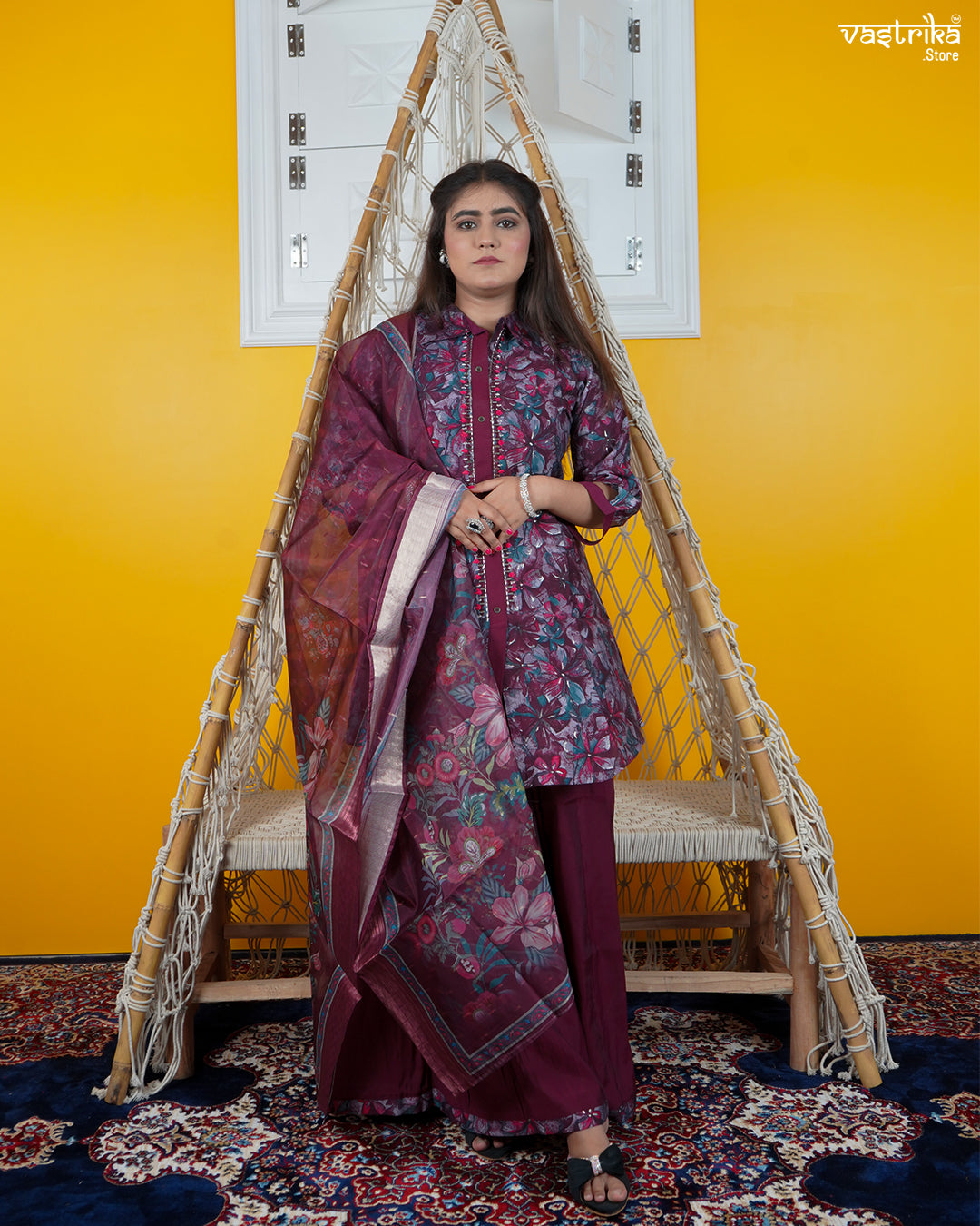 Bottom: Paired with border-printed palazzo pants that add movement and charm to the outfit.