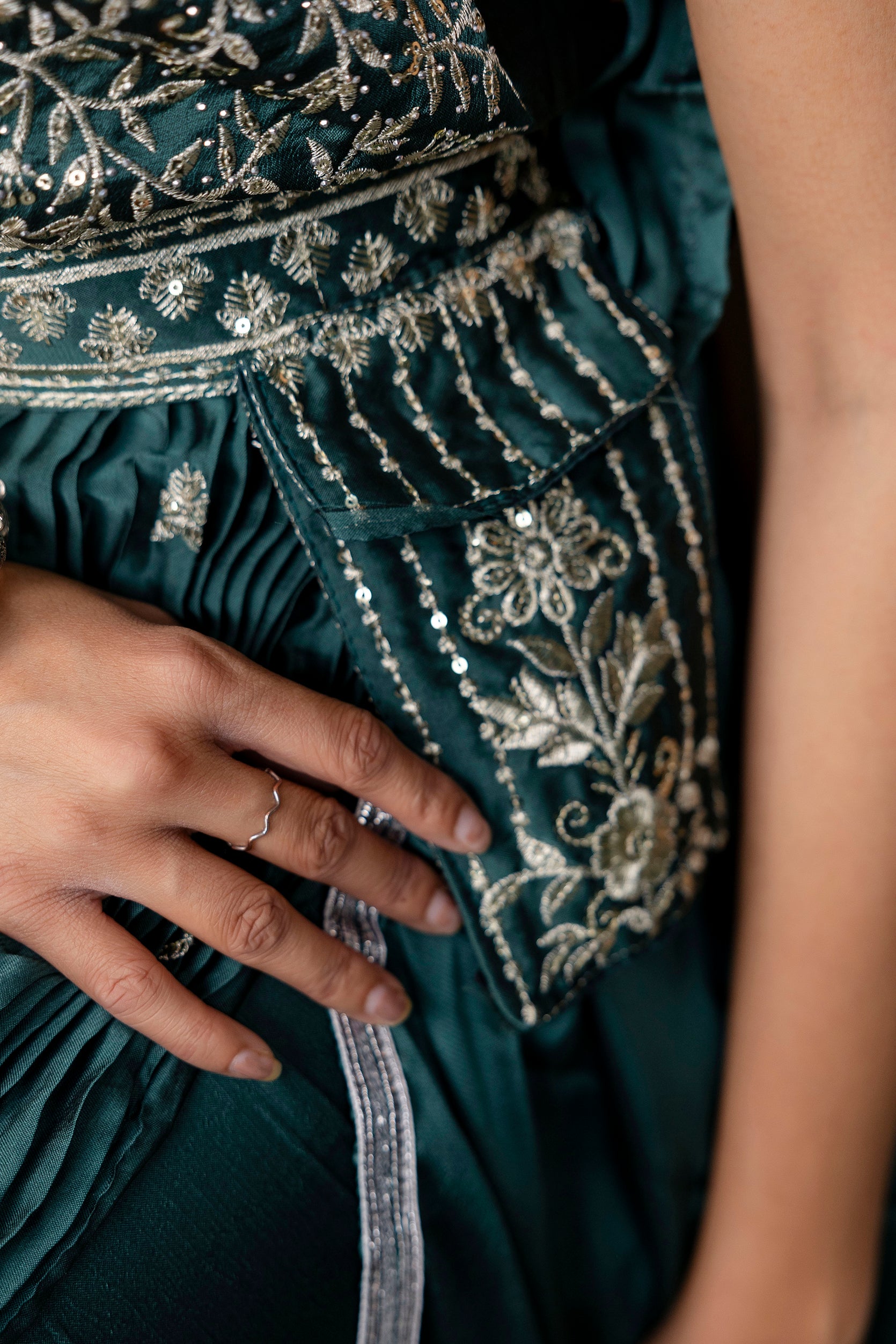 Add a touch of sophistication with this kurti featuring exquisite sequined and jari detailing that radiates elegance. Paired with a beautifully jari-worked sharara, this set offers both flair and comfort. The look is complemented by a plain, solid dupatta that enhances the outfit’s overall simplicity while showcasing the detailed craftsmanship. Perfect for festive events or evening wear, this ensemble blends traditional beauty with modern grace.