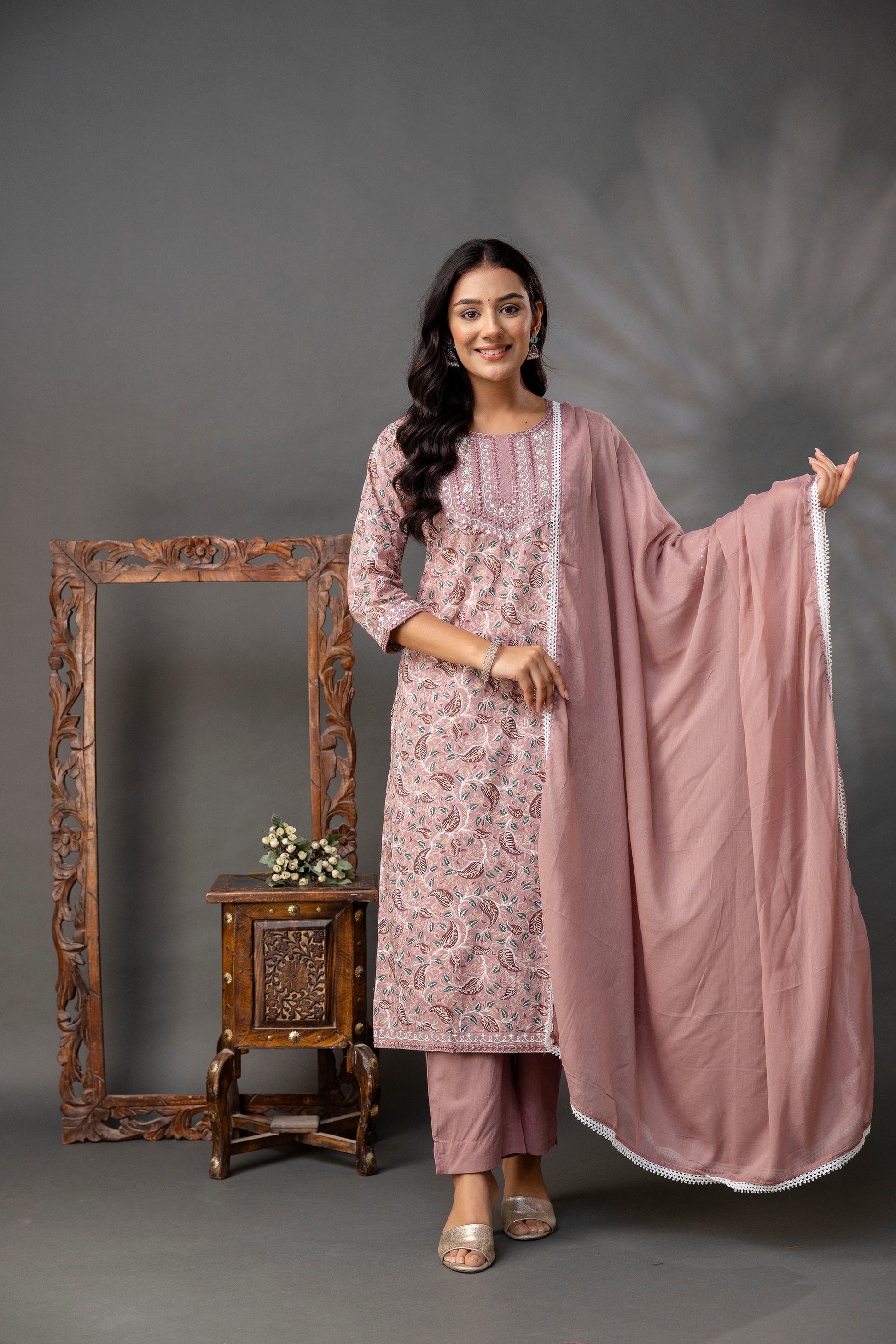 This stylish round-neck kurti is enhanced with detailed thread work, paired with simple plain pants and a coordinating plain dupatta. A perfect mix of elegance and comfort for a refined look.