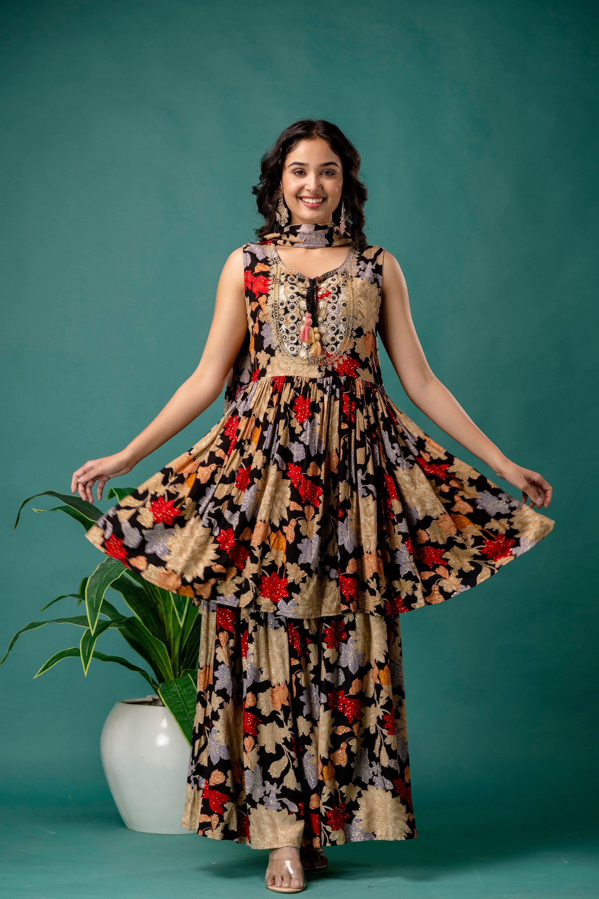 Printed Round Neck Kurti with Resham Work, Printed Dupatta & Printed Trouser