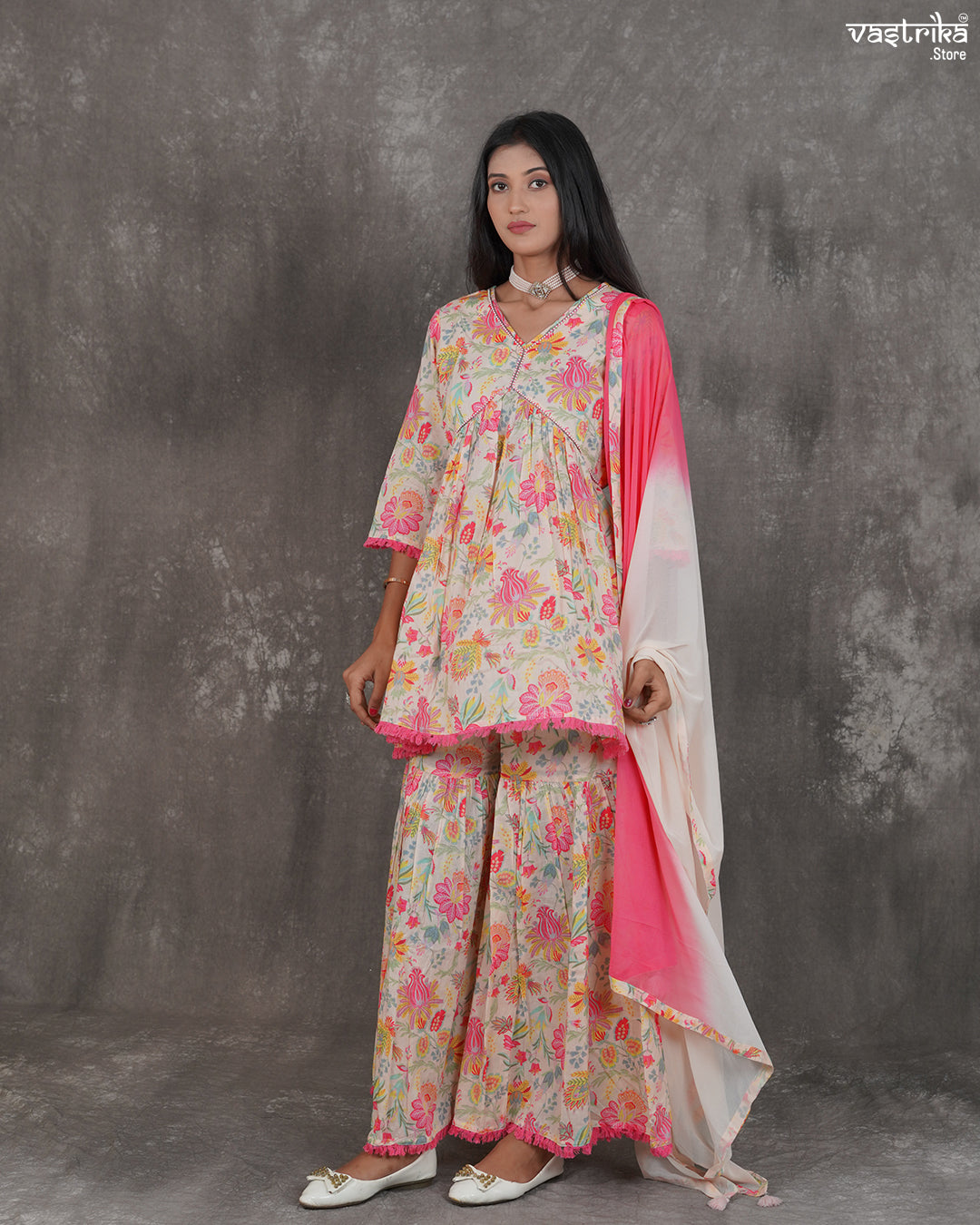 Embrace ethnic elegance with this printed V-neck kurti 👗, designed with a stylish and flattering cut. The Alia-cut style sharara bottoms 👖 offer a modern twist to traditional attire, creating a flowy, graceful silhouette perfect for festive wear.