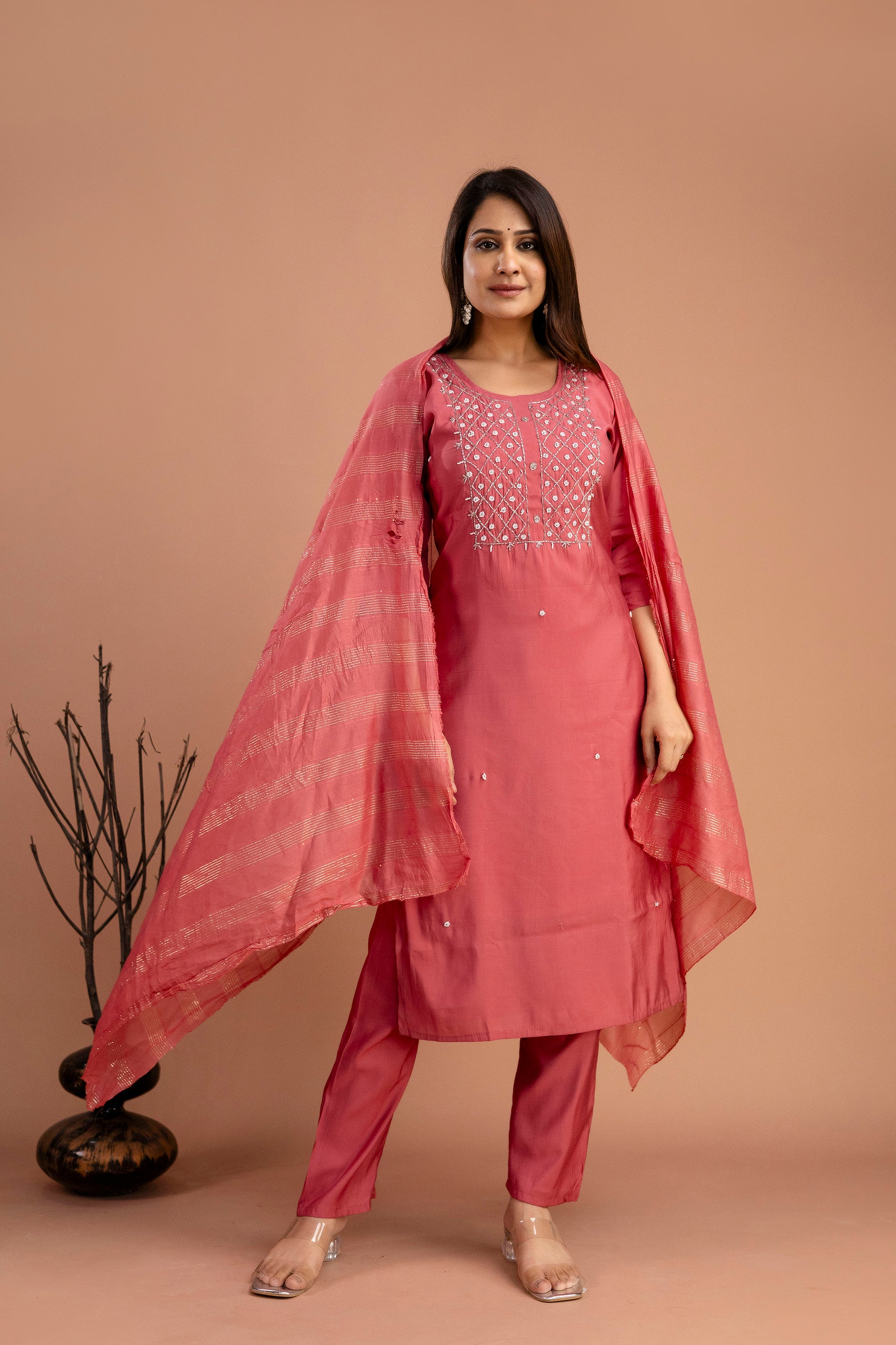 Handworked Round Neck Kurti with Plain Dupatta & Plain Trousers