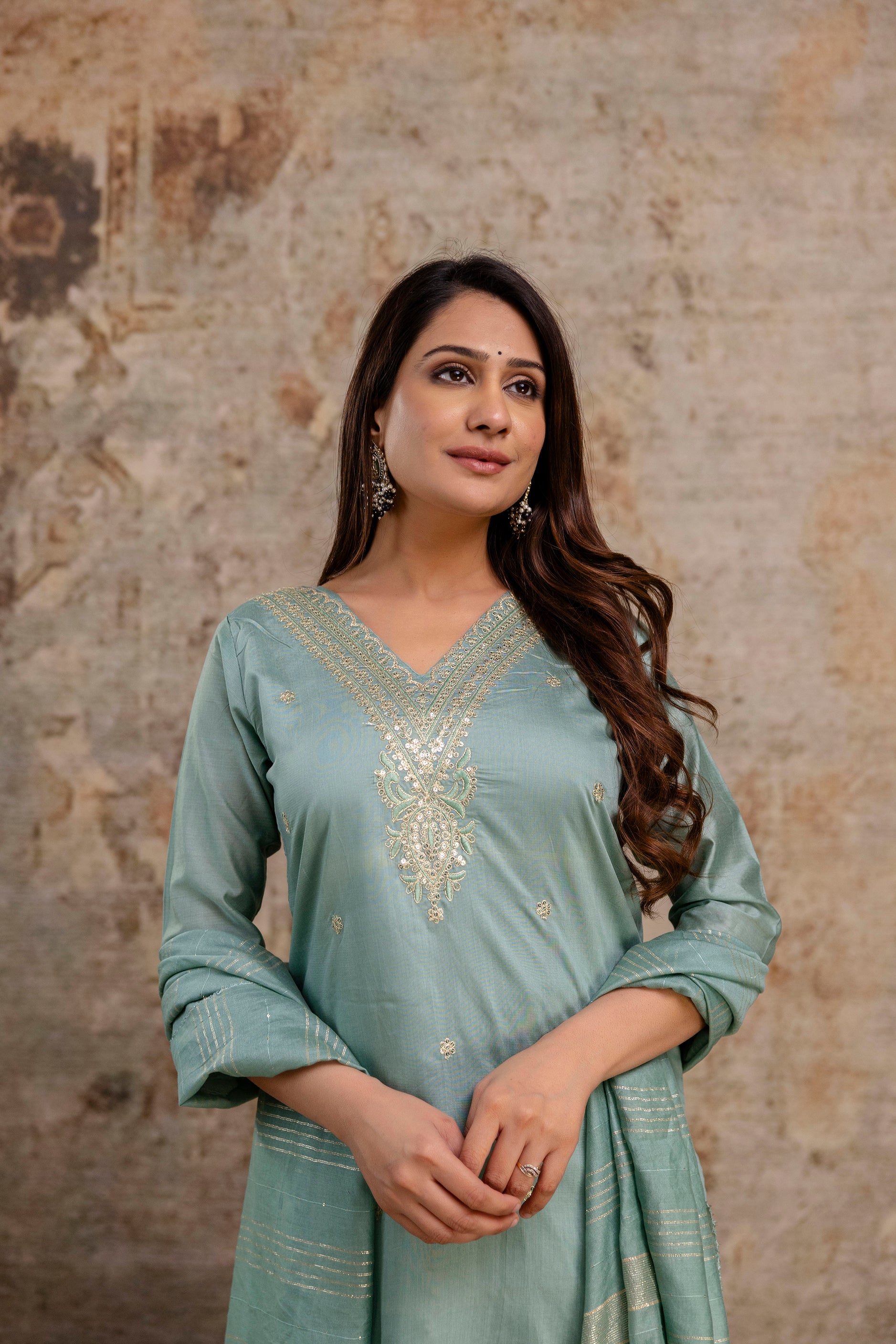 "Embrace elegance with this luxurious Chanderi silk kurti, featuring a flattering V-neck design and adorned with delicate codi sequence work that adds a touch of glamour. The matching pants are elegantly crafted with intricate sequence detailing, creating a stunning contrast with the silky fabric. Paired with a graceful Brazo silk dupatta, this ensemble exudes sophistication and charm. Perfect for festive occasions or special events, this outfit blends tradition with modern style, ensuring you stand out in every crowd."